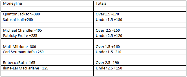 ——————– Brad’s Analysis: Rampage should be able to get to Ishii’s chin in this one, but if this fight goes wrong for him, it will be his worst nightmare. 15 minutes of being stuck underneath a slow-paced, positional grappler like Ishii is probably his version of hell. I don’t think we’ll have to worry about that however, as Ishii’s takedown game in MMA isn’t all the great, and Rampage has always had solid takedown defense. If Michael Chandler stands with Patricky, he’s putting himself in a bit of danger, but even then he should be able to win the fight on activity so long as he avoids a knockout. If he takes it to the ground, he should be able to wear Pitbull down and eventually find a finish. The demise of Chandler was always very heavily overstated, and I think he continues to prove that here. Pitbull is much closer to the Dave Rickelses and Derek Camposes of the world than Eddie Alvarez and Will Brooks. This is the matchup Matt Mitrione would have picked if he could have picked his Bellator debut (and the only reason I don’t think he did is because he probably has no idea who Carl Seumanutafa is). Mitrione is the faster, longer, more powerful, and more varied striker of the two, and this will be a striking match. The only reason the line isn’t bigger: heavyweights. Rebecca Ruth’s only pro loss was a split decision against Jocelyn Jones-Lybarger, who it turns out is pretty decent. That result on its own gives me more confidence in Ruth than any of MacFarlane’s wins over her inexperienced, limited opponents. I won’t be betting this one, but if the line flips, Ruth will be the play.